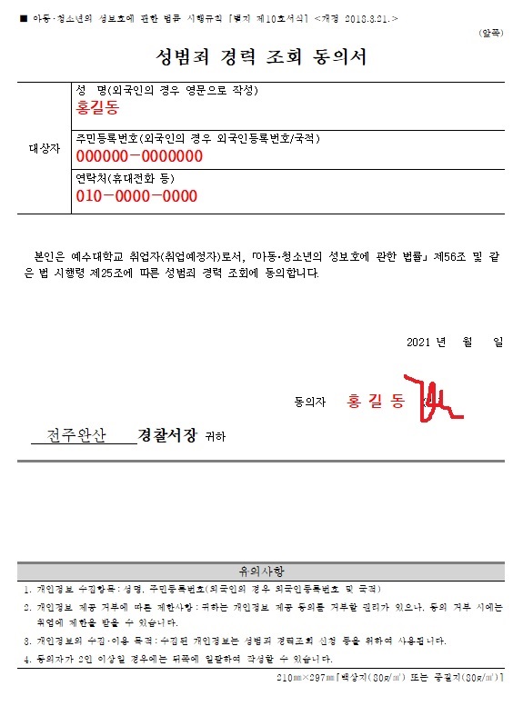 성범죄 경력조회 동의서 양식(한글파일)과 견본 파일(jpg) 첨부합니다.