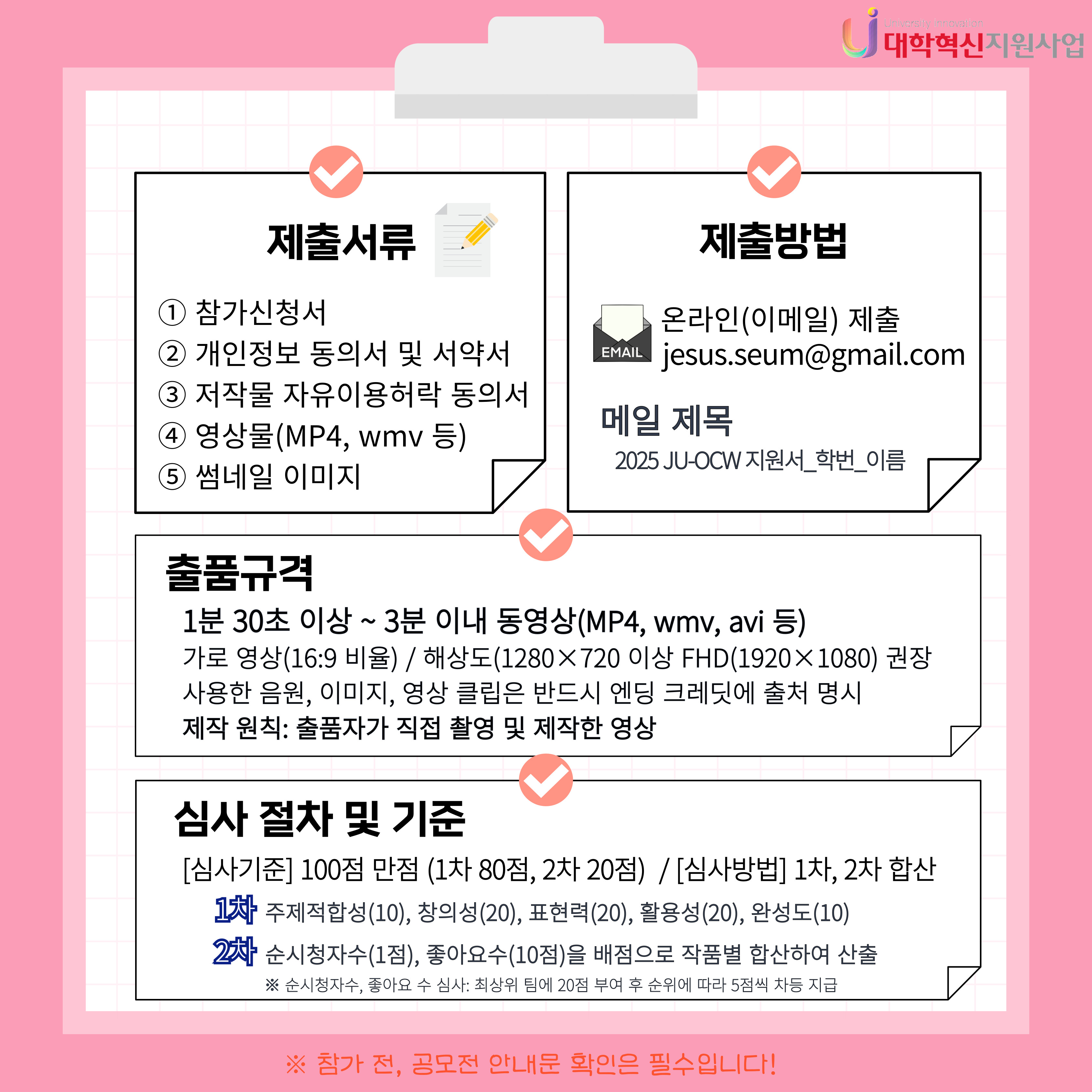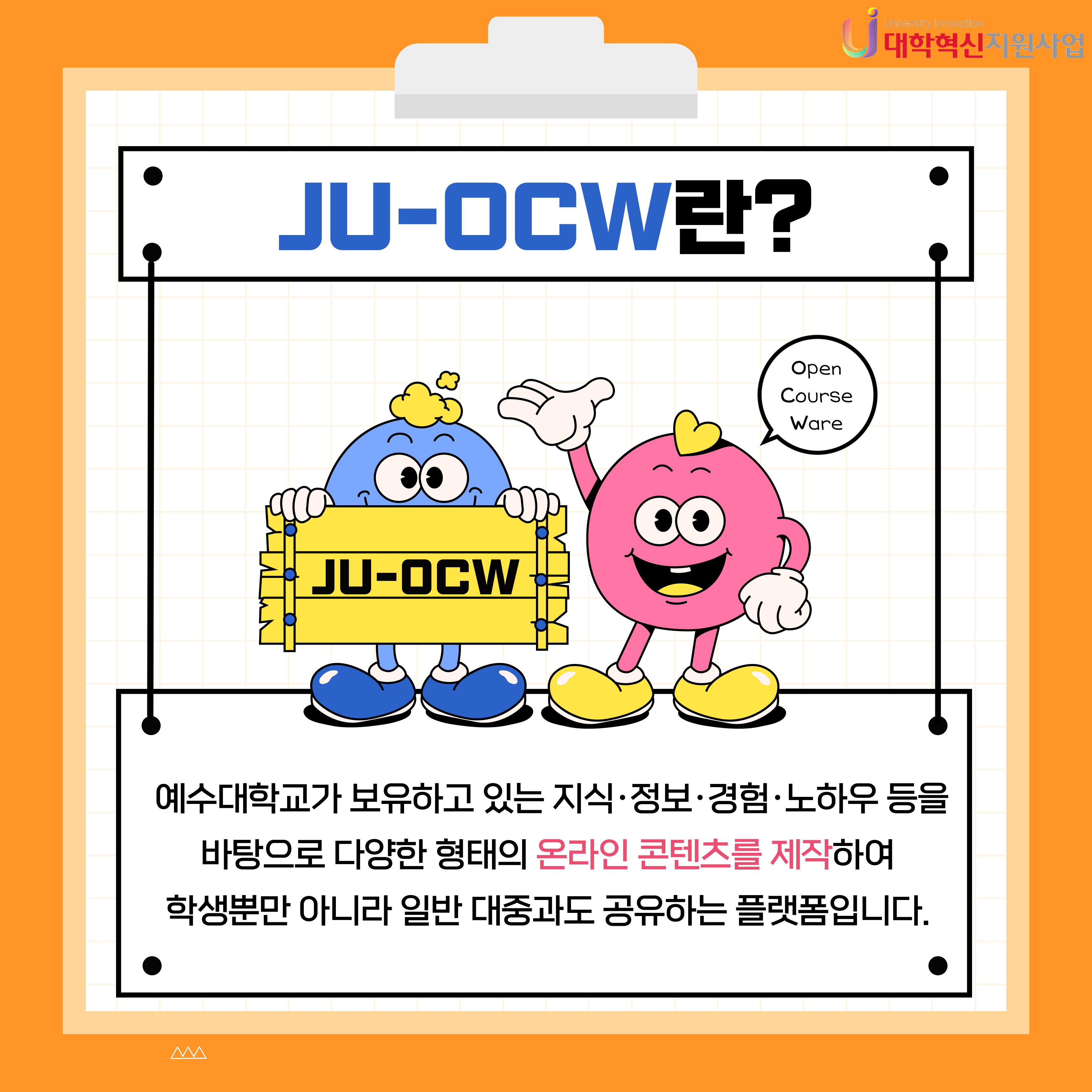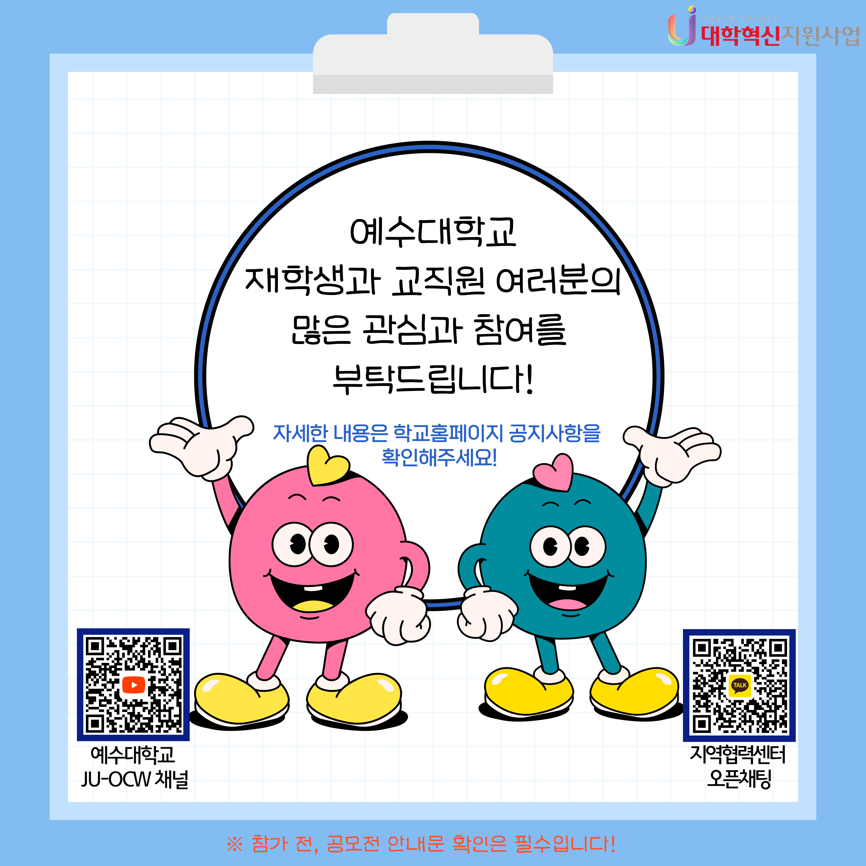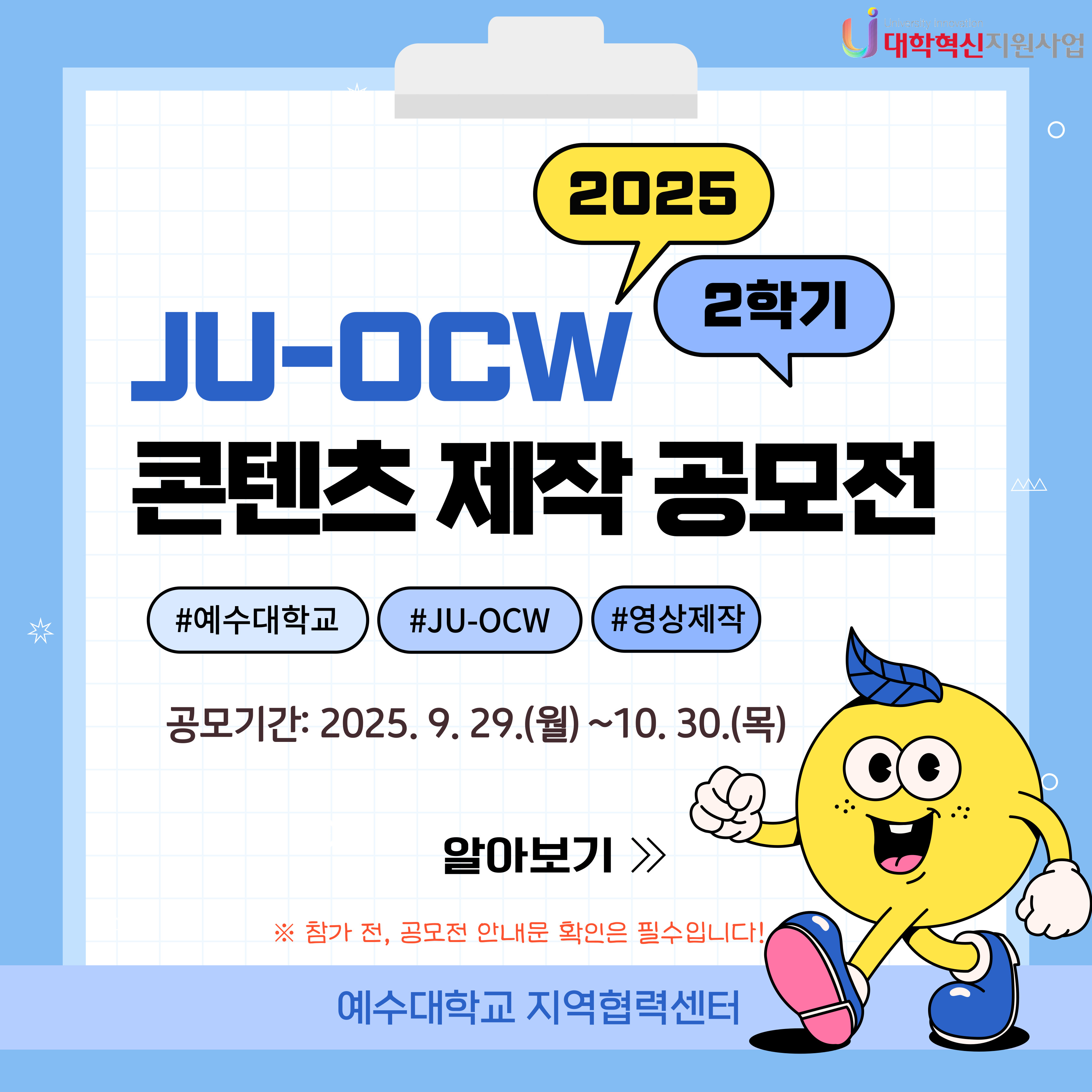 예수대학교 지역협력센터에서는 JU-OCW 콘텐츠 제작 공모전을 다음과 같이 진행하고자 하오니