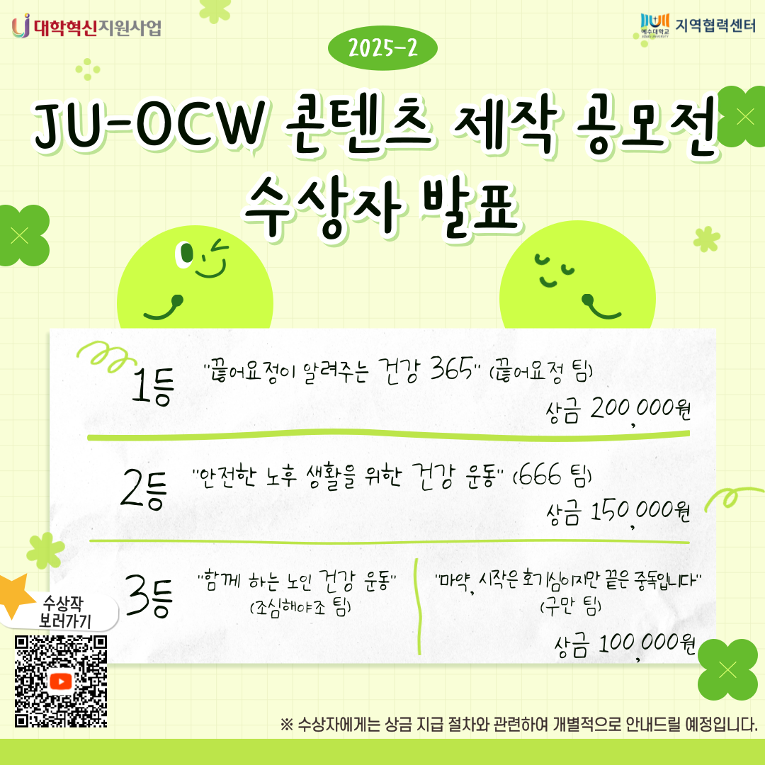 2025학년도 2학기 JU-OCW 콘텐츠 제작 공모전 수상자를 발표합니다.