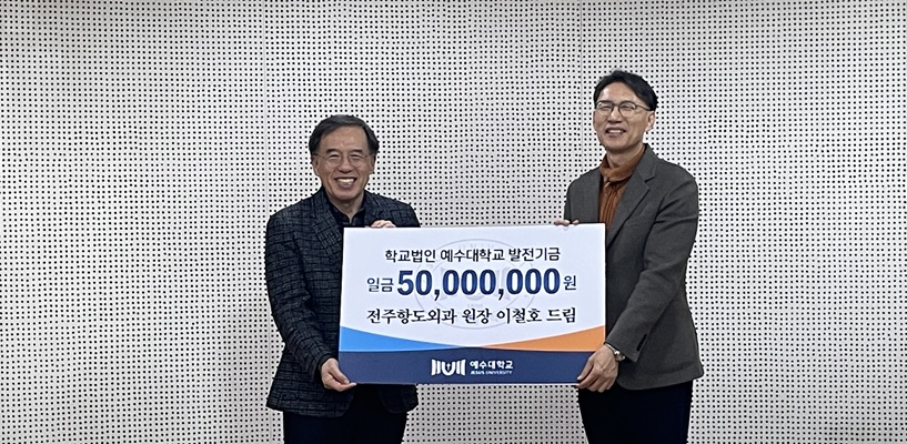 학교법인 예수대학교 이철호 이사장(전주항도외과)이 법인발전기금으로 5천만원을 기탁했다. 이철호 이사장은 매년 꾸준한 기부를 통해 법인과 대학의 발전에 힘을 보태고 있으며, 이번 기탁으로 발전기금은 총 2억원에 이른다.