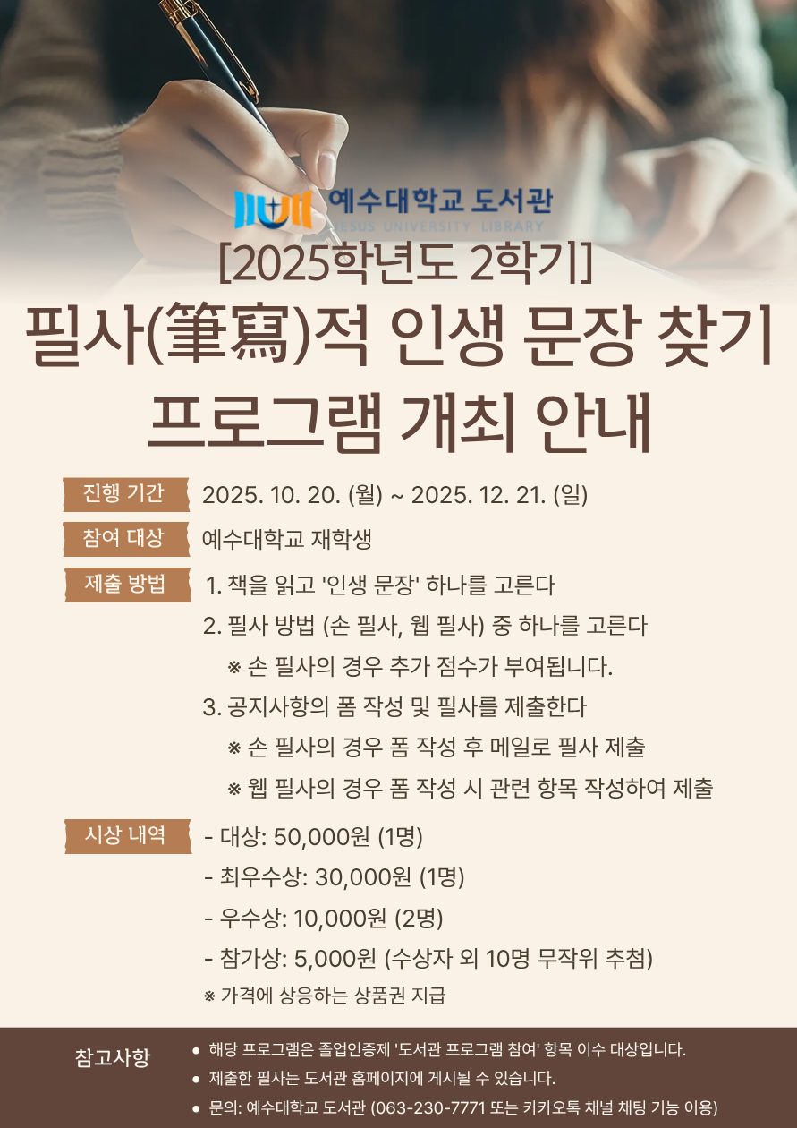 독서 권장 및 독후 감상 표현에 대한 흥미 유발을 위해 대학혁신지원사업의 일환으로 도서관에서 2025학년도 2학기 「필사(筆寫)적 인생 문장 찾기」 프로그램을 개최하여 아래와 같이 안내 드립니다.